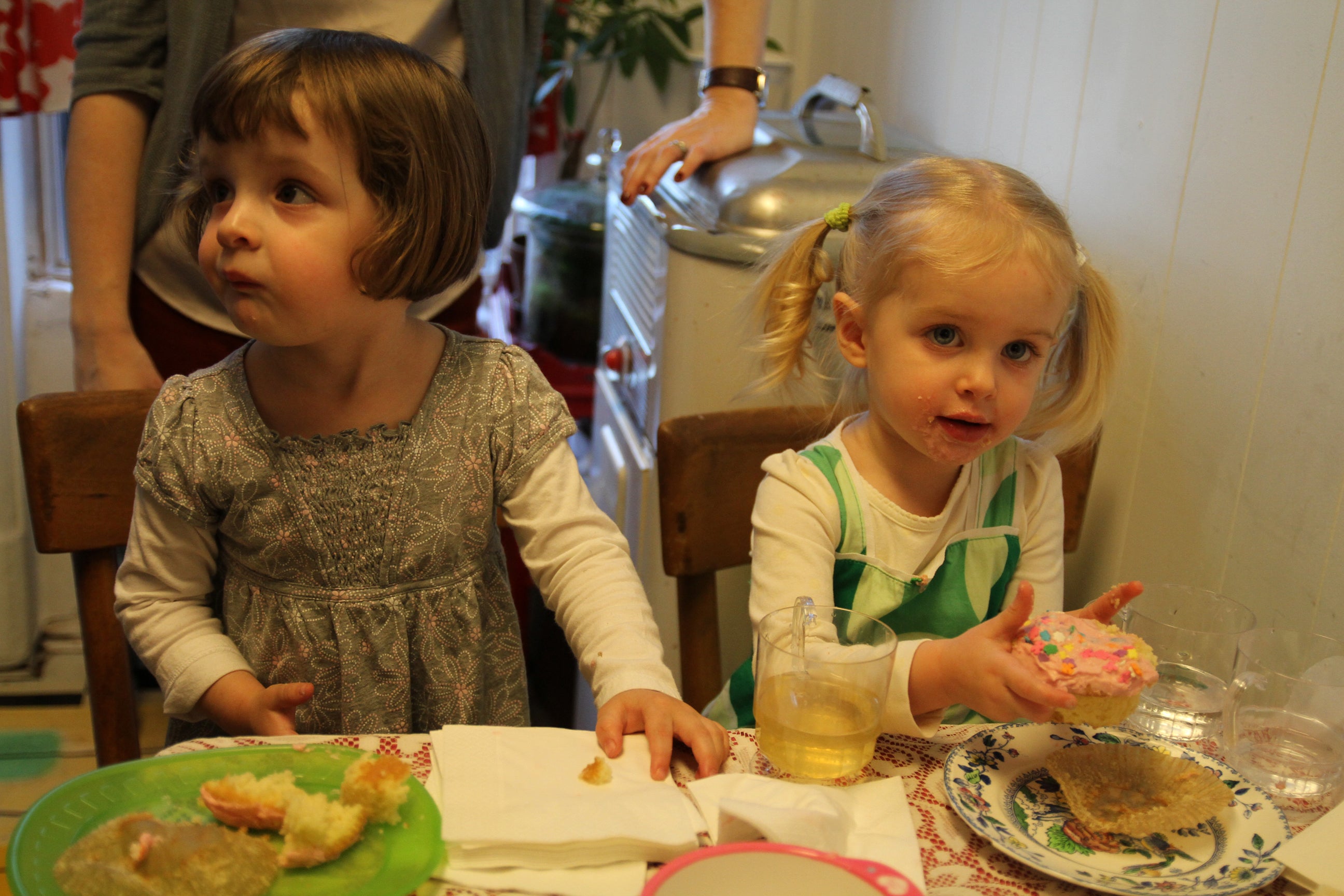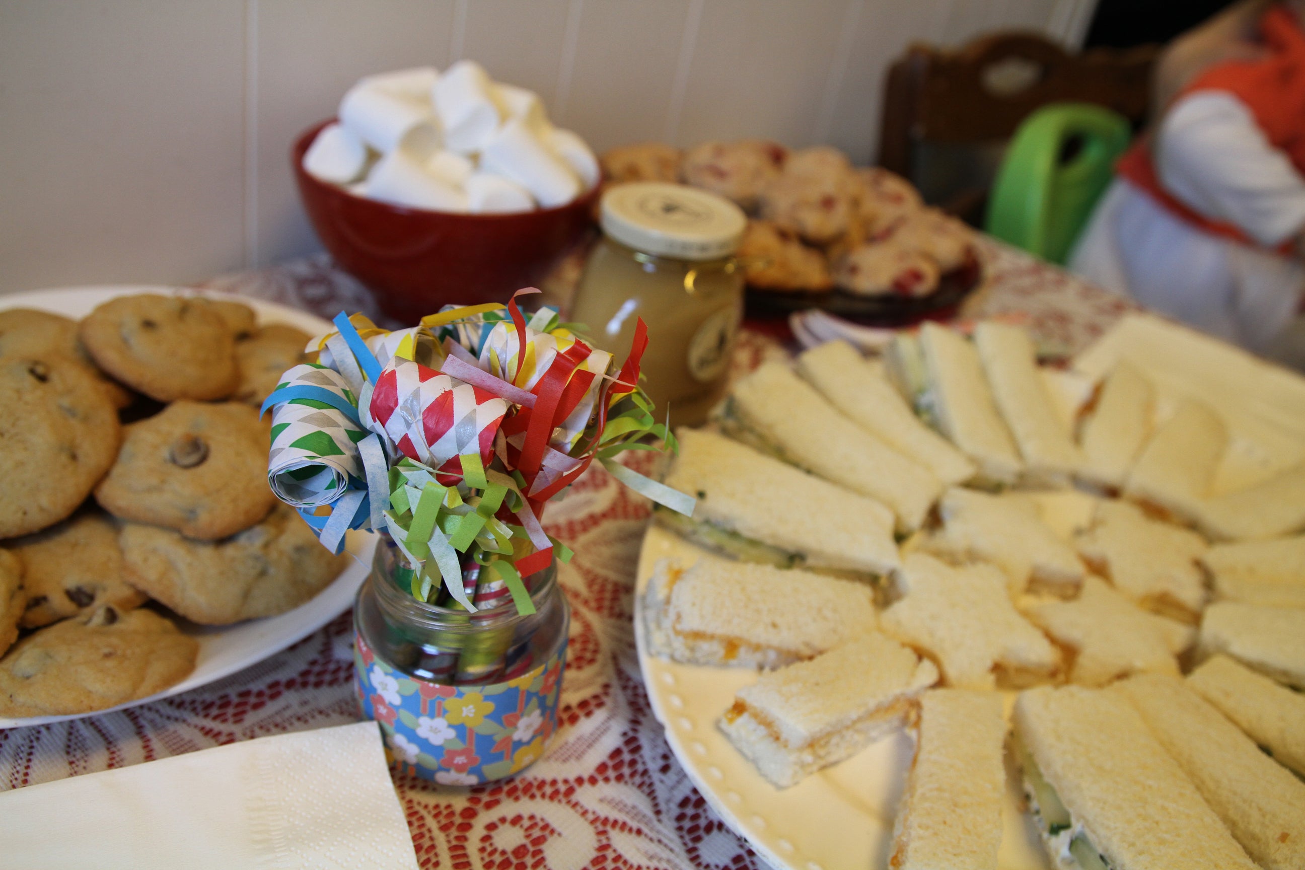 For budget reasons, we opted not to provide a full meal (is there such a thing for toddlers, anyway?). I made everything myself, with the help of my daughter (she loved being involved). Since it was a tea party, we had chamomile and hot chocolate, finger sandwiches, scones and cookies. Instead of a cake, I made cupcakes. And voila: More than enough for everyone, but not too much for our tiny kitchen table. Honestly, the kids probably would have been happy with just cookies and cupcakes.