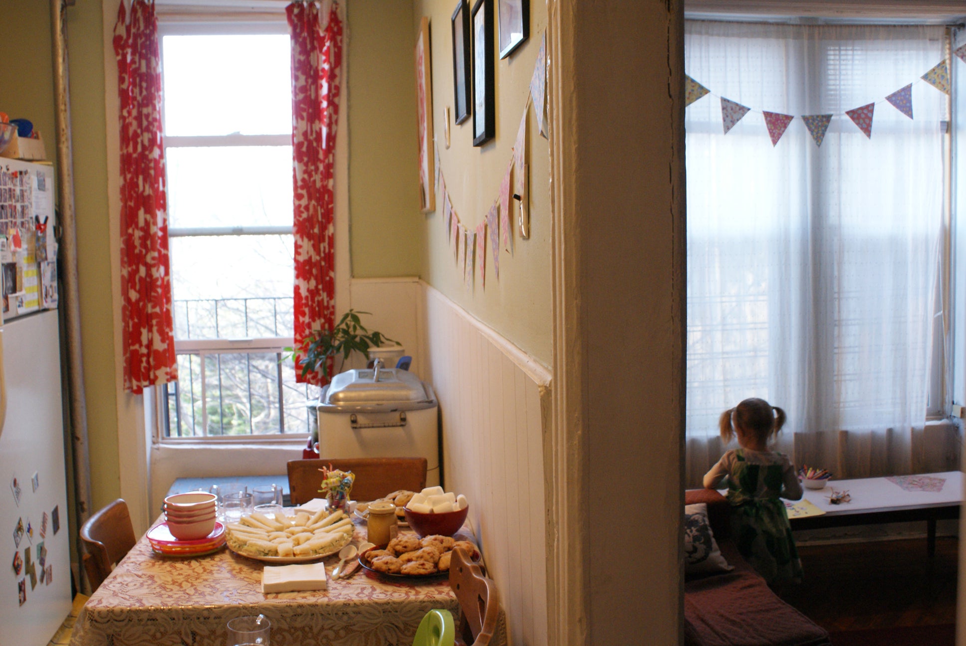 A small space may require a creative transformation. Homemade decorations save money and lend a homey, festive feel. Crafting them is also a great way to get the birthday kid involved. As we collaborated on a bunch of little drawings (which I then strung on a garland) and fashioned simple paper bunting out of origami paper triangles, she became really excited about the upcoming bash. It couldn't have been easier and we made everything out of supplies we had around the house.
