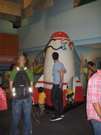 Many George fans will remember when he took off for the moon, and now your kids can too. This makes for a great photo op. Be sure to get your kids to peek out of the porthole before they slide down.