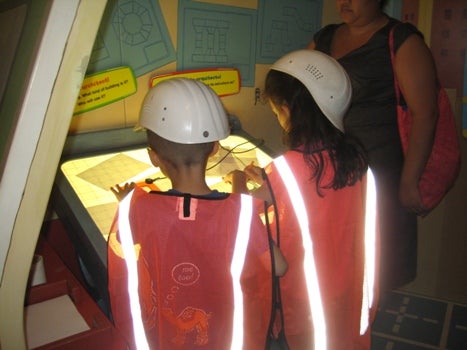 Kids get to play engineer by putting giant foam cubes onto a hand-cranked conveyor belt, and watching as they travel around the site. Other activities include building with blocks and working on blueprints at the drafting table.