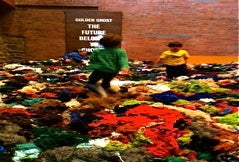Take a beautiful, and very deep, brick room and fill it, wall-to-wall, with a thick layer of soft, colorful yarn and thread waste and what do you get? A most unusual, and thoroughly fun, bouncy space where running, jumping, flipping through the air, turning summersaults, and of course, digging for treasure, are simply irresistible--and not just for kids. My five-year-old son wanted to stay all day. So did my husband.