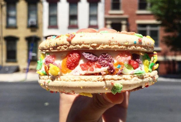 Milk Sugar Love's "fruity pebble mac daddy" is comprised of fruity pebble ice cream sandwiched between two giant macaroons.