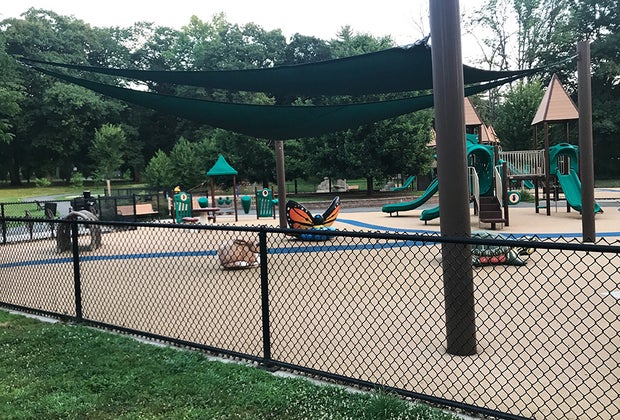 Kids and caregivers can take shelter from the sun on shaded benches at Morgan Pellowski Playground.