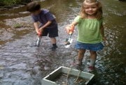 We brought some wooden screens, some tarp, shovels, and buckets. Then we herded the kids down the grassy trail to the stream. The adults staked out a spot near the brook to lay out a tarp. We then handed the kids the screens and shovels and told them to walk into the middle of the river and start digging. Pretty soon the kids were knee-deep in muddy water, laughing and having a blast, and shoveling heaps of mixed rocks onto the screens. We helped them carry it out of the water and dumped them onto the tarp. I don’t know what was more exciting for the kids, the swishing of water in their shoes as they waded in the brook, or pawing through the rocks and dirt in search of fossils.
