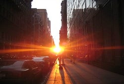 As opposed to popular belief, the NYC street grid is not on the North-South axis. It is actually 30 degrees off. But a few times a year the sun's axis is parallel to the street grid. On those days, the sun sets straight down the street so if you go to the far east end of a street that goes all the way across the island (like 34th or 42nd Streets) you can watch it sink straight down across the whole city.