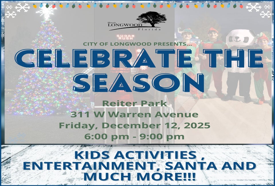 Join the festivities at the City of Longwood's annual Celebrate the Season event. This holiday street party features an array of activities, including photo opportunities with Santa, music by DJ Dennis, live performances, kids activities, and more.