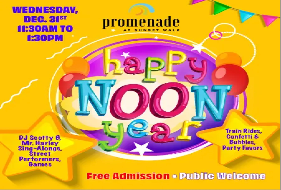 Ring in the “Noon Year” with a family-friendly celebration at the Promenade at Sunset Walk. Enjoy a festive confetti blast along with live entertainment from DJ Scotty B and Mr. Harley, plus street performers, games, bubbles, and complimentary party favors. Kids can also ride The Pearl Express Steam Engine and bounce on bungee trampolines.