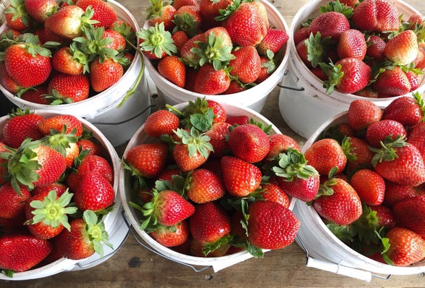 Fill a bucket with fresh-picked strawberries at Amber Brooke Farms.