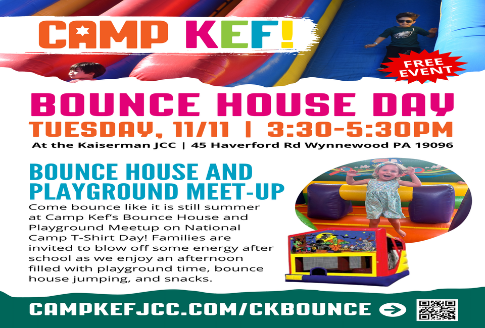 Come bounce like it is still summer at Camp Kef’s Bounce House and Playground Meetup on National Camp T-Shirt Day! Families are invited to blow off some energy after school as we enjoy an afternoon filled with playground time, bounce house jumping, and snacks.