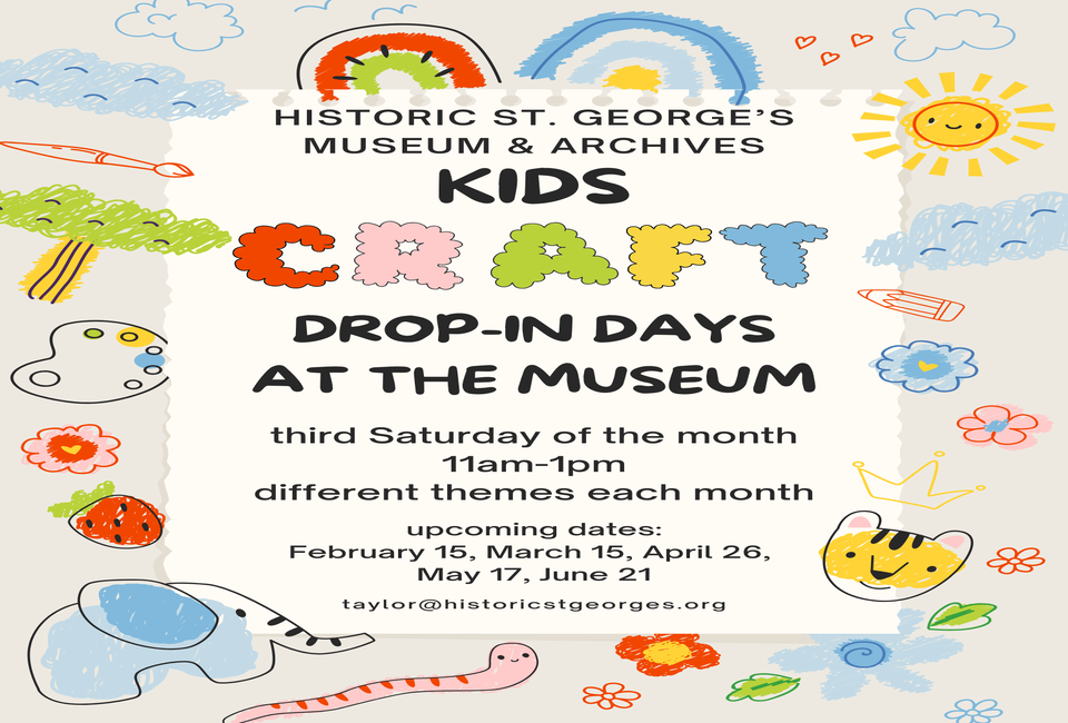 Don't miss the lkids craft drop in day. Located at the Historic St. George’s Museum and Archive. Each month there is a different craft theme.