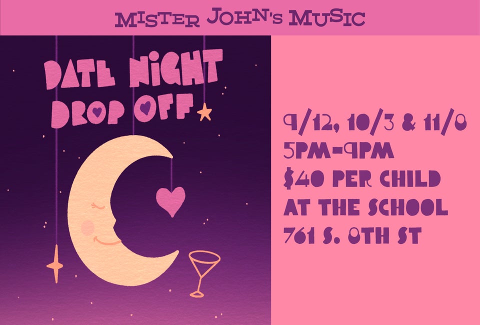 ️ Fridays September 12th, October 3rd and Saturday, November 8th, drop off your (4+ year old) children at The School for Mister John’s Music Date Night Drop-Off and enjoy a glorious four hours to yourselves to do, well, whatever you want! Go on a date, catch a grown-up show, enjoy a quiet dinner in… just be back by 9pm!