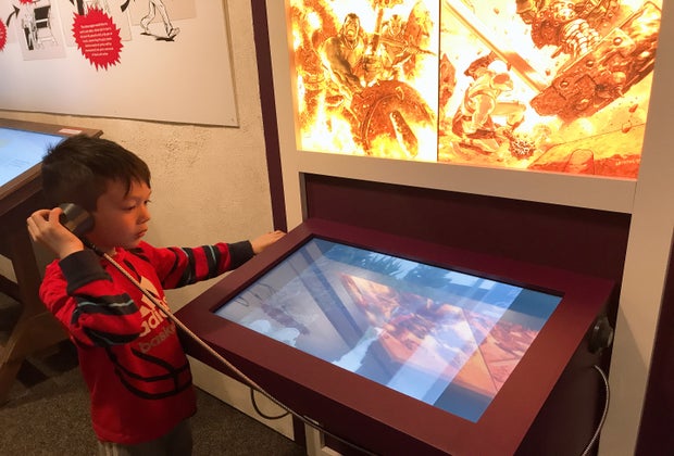 I loved the interactive touch screens that worked to provide you both with the basic information as well as the opportunity to really dig deep on a topic if it was a one that interested you. We learned about how comics are made, we talked about story and sequence. Doing so with a young reader was a really special part of the experience.