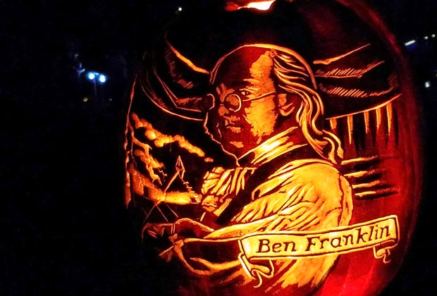 There are lots of pumpkins carved just for the city of brotherly love, like this expertly carved Ben Franklin pumpkin. Photo courtesy of the author