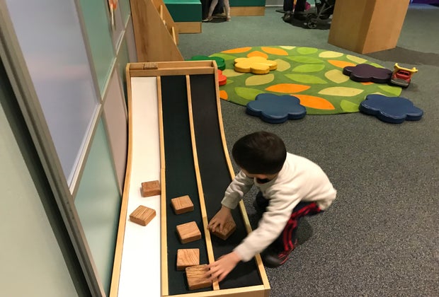 Test your hypothesis with science experiments and use real lab tools, like a microscope. This might be the most science-heavy portion of the exhibit and it is also a really solid introduction to scientific thought since many children visiting are not in grade school yet. My son loved the building blocks in the exhibit. He also enjoyed testing his theory on which surface would propel an object faster. For my race-minded little boy, this was especially fun to try over and over. The classroom also features a learning rug and more materials to test, like magnets, gears, and bugs, as well as concepts like friction, speed, and size.