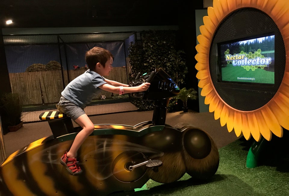 On the bee bike you use pedal-power to fly around and collect honey and make nectar. Unfortunately, my little guy was a bit small for the exhibit, but he did his best! We also explored some of the more physical play options, from a mini golf course to a place to try your hand at throwing or kicking a ball for speed, to a big dirt pile, my little guy was loving it!