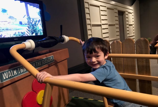 There is so much to do when you first enter the exhibit that it takes a moment to take it all in. You can ride a bee bike to collect nectar, be predator or prey in a food web pond, dress up like living creatures, walk through the seasons, or even try your hand at building a birdhouse, and more! The goal of the exhibit is to teach kids about biology, chemistry, and math, all while exploring things they may encounter in a park or their own backyard (depending on where you live).