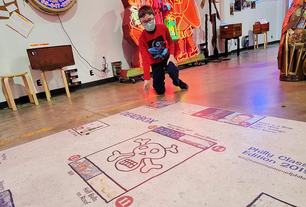 Corkboards are posted throughout the space for visitors to leave their own reflections on the artwork. Len Davidson, the founder of the museum, was present during our visit and served as a fount of information, and you're likely to catch him there on any given day. He encouraged patrons to play a version of the Philadelphia street game "Deadbox" in the central floor space of the museum. To play the game, players compete to flick bottle caps filled with wax around a board, attempting to hit numbered squares in sequence. If you hit another player's bottlecap with your own, they have to start over again. The goal is to make it to the end without crossing over the skull-and-bones symbol in the middle of the game board, which would also send a player back to the start.