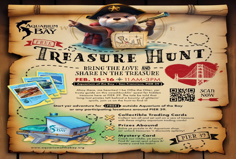 Start yer adventure outside the Aquarium of the Bay or any participating locations around Pier 39. As you follow the map you will find collectible trading cards at each location. After you have collected them all return to the Aquarium to try and solve the puzzle where you will unlock treasures and discounts!
