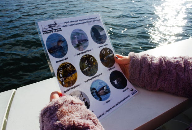 Once the boat leaves the harbor, educators—and eager little passengers—will begin looking for winter waterfowl. There are dozens of birds that migrate to the Nutmeg State for the winter months. We saw our fair share of long-tailed ducks, brants, and razorbills. We even got to see a loon! The on-board staff supplied us with a handy reference guide with photographs of birds commonly seen during the winter months.