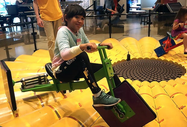 1. There's nary a math problem in sight: When you walk into MoMath, which occupies 19,000 square feet of space across from the kid-friendly Madison Square Park, you might expect to be surrounded by times tables and standard algorithms. Instead, you're greeted with colorful interactive displays, each of which teaches a core math principle but in a hands-on, interactive way. Near each interactive exhibit, you'll find a tablet explaining the underlying math principle, explained for every level of learner from math novice to mathematician. My girls dove right in to the Hyper Hyperboloid, where a simple spin in a chair led to the appearance of a curved surface made with only straight lines. From there, they were off, bopping from one display to another—and there are plenty to choose from, with more than 40 different displays to explore. We spent an entire afternoon and didn't get to all of them!