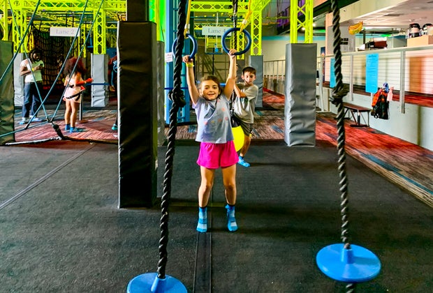 Tackle rings, tightropes, floating balance beams, and other obstacles on the ninja warrior course.