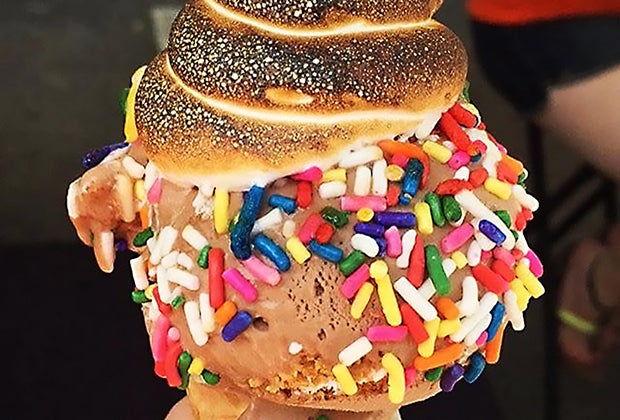 Aspecialty cone with a roasted marshmallow on top is an extra sweet way to indulge kids on their birthday. Photo courtesy of Bona Bona Ice Cream