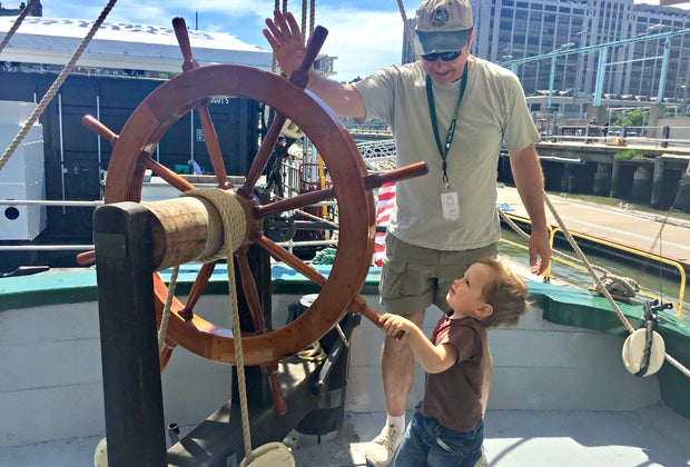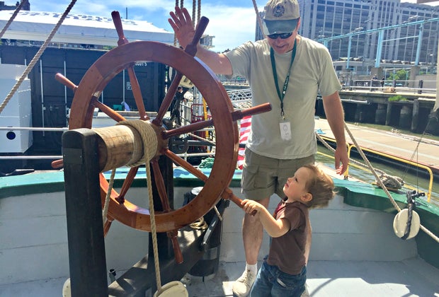 The voyage also marks the 200th anniversary of the construction of the Erie Canal and the centennial of the commemoration of the Barge Canal in New York State. To mark this occasion, the Lois McClure—a replica of an 1862 canal barge—will be on site, courtesy of The Lake Champlain Maritime Museum. Docents posted throughout the ship give guests the low-down on the fascinating life of a canal barge worker in the 19th century. Besides the bowl of free chocolate, my son loved exploring the boat, turning the vessel's gorgeous mahogany wheel, and climbing into the tiny sleeping quarters below deck.