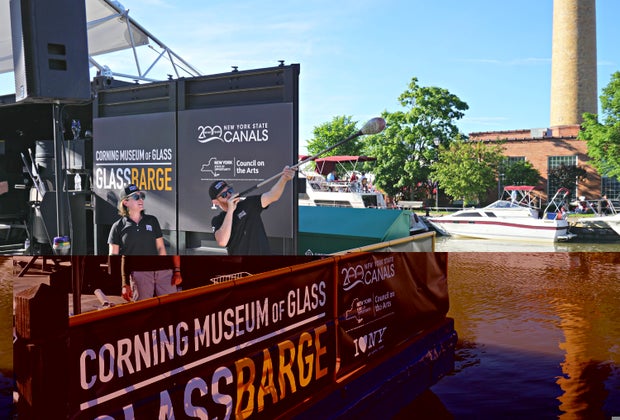 The 30 x 80 foot barge—specially designed for glass blowing—is taking the same route that the Brooklyn Flint Glass Company (now Corning Inc.) took down the Hudson River and Erie Canal in 1868. It will drop anchor and be open for visits in port cities and towns along the Erie Canal, as well as in the Hudson River Valley and Finger Lakes regions.