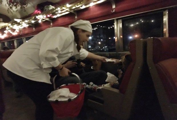 The train begins its slow, rumbling journey (about 30 minutes there and then 30 minutes back), and segments of the story are periodically re-enacted with the riders. We really can’t say enough about the kindness and authenticity of the crew. The conductor speedily punches the Golden Tickets with the kids’ initials, while the chefs lead the children in games and holiday singalongs. When my 5-year-old started getting a little unruly near the end—a late bedtime combined with heaping amount of sugar turns him a bit feral—they came over to distract with conversations about Santa. All are happy to take family photos and selfies.