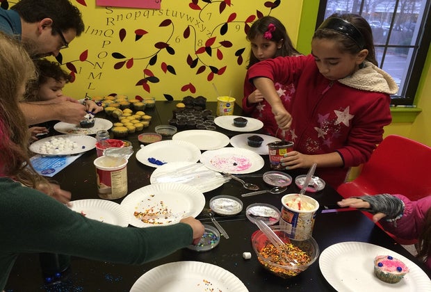 Decorating a holiday cupcake at one of the many Frosty Day activity stations.