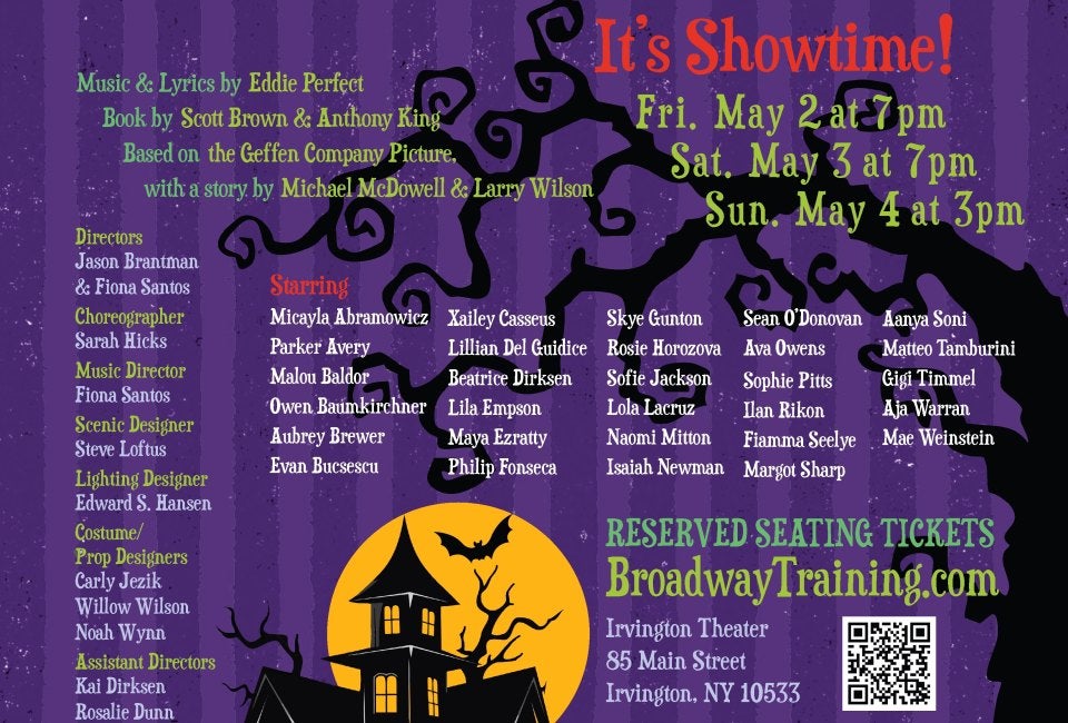 “It’s showtime!” The ghost-with-the-most comes to the Irvington Theater stage in this frightfully funny musical based on the beloved motion picture turned Broadway phenomenon. Don’t miss this wacky theatrical party for the entire family — starring Broadway Training Center’s cast of student performers.