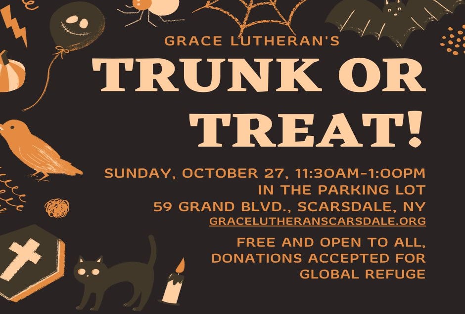Join the annual trunk or treat in Scarsdale's Grace Lutheran Church parking lot. There will be candy, pumpkin decorating, and more free fun!