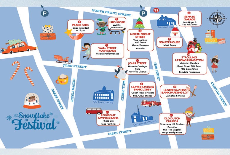 Enjoy carolers, s'mores, horse-drawn carriage rides, flame throwers, an aerialist, ice sculpture carvings, and more at Kingston's Snowflake Festival. Don't miss the arrival of Santa and Mrs. Claus on an antique fire truck to light the holiday tree. Open stores offer treats and hot beverages.