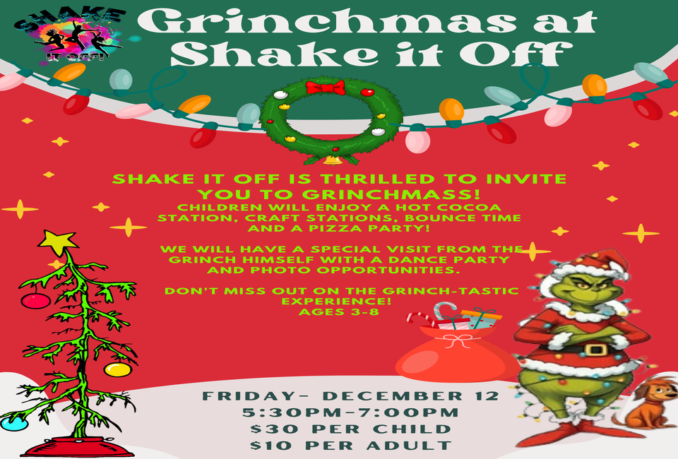 Shake it Off invites you to celebrate Grinchmas. This event celebrates all things Grinchy, complete with meeting the Grinch himself, a dance party, and photo opportunities. There will also be a hot cocoa station, a fun craft, and delicious pizza.