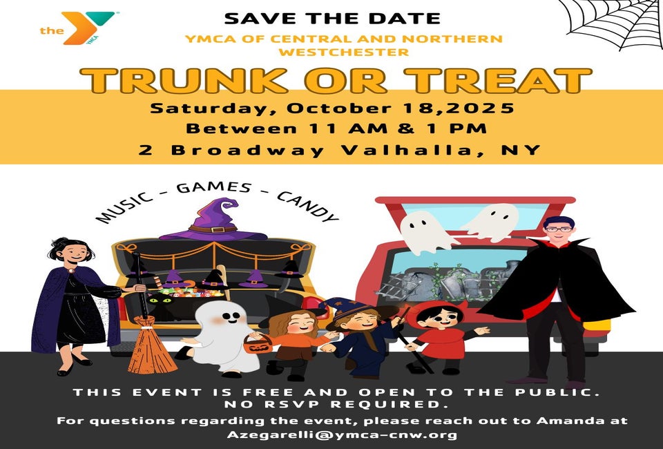 Join YMCA of Central Northern Westchester for a spooktacular Halloween Trunk or Treat at 2 Broadway, Valhalla (next to Kensico Dam). Bring your costumes, your smiles, and get ready for some Halloween fun.
