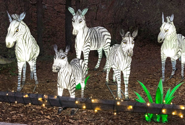 We set off on the one-way walking path past the flamingo exhibit (which had a "Margaritaville" tropical vibe under Christmas lights), and then into the heart of the zoo. A cool feature that's new to ZooLights this year is lantern-lit sculpture animals, many of which were on display at the Franklin Park Zoo in the fall. Brightly, life-sized lit pandas, zebras, and more add a cheery element to the display that we hope returns in future years.